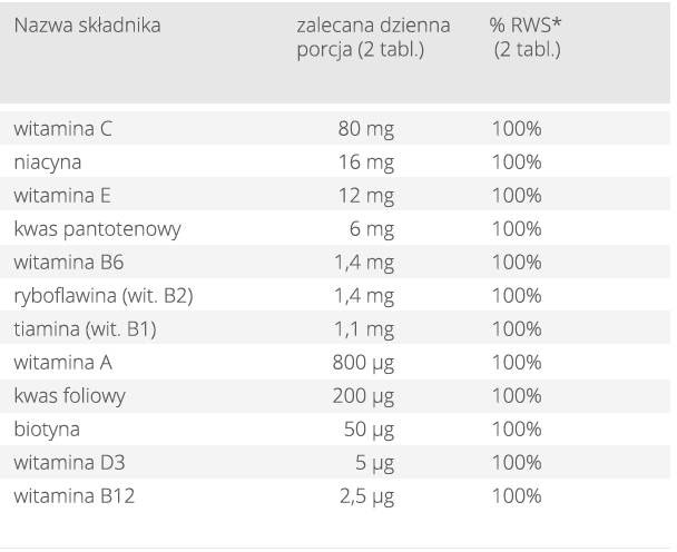 Zawartość witamin i składników mineralnych zalecanej w dziennej porcji – 2 tabletki